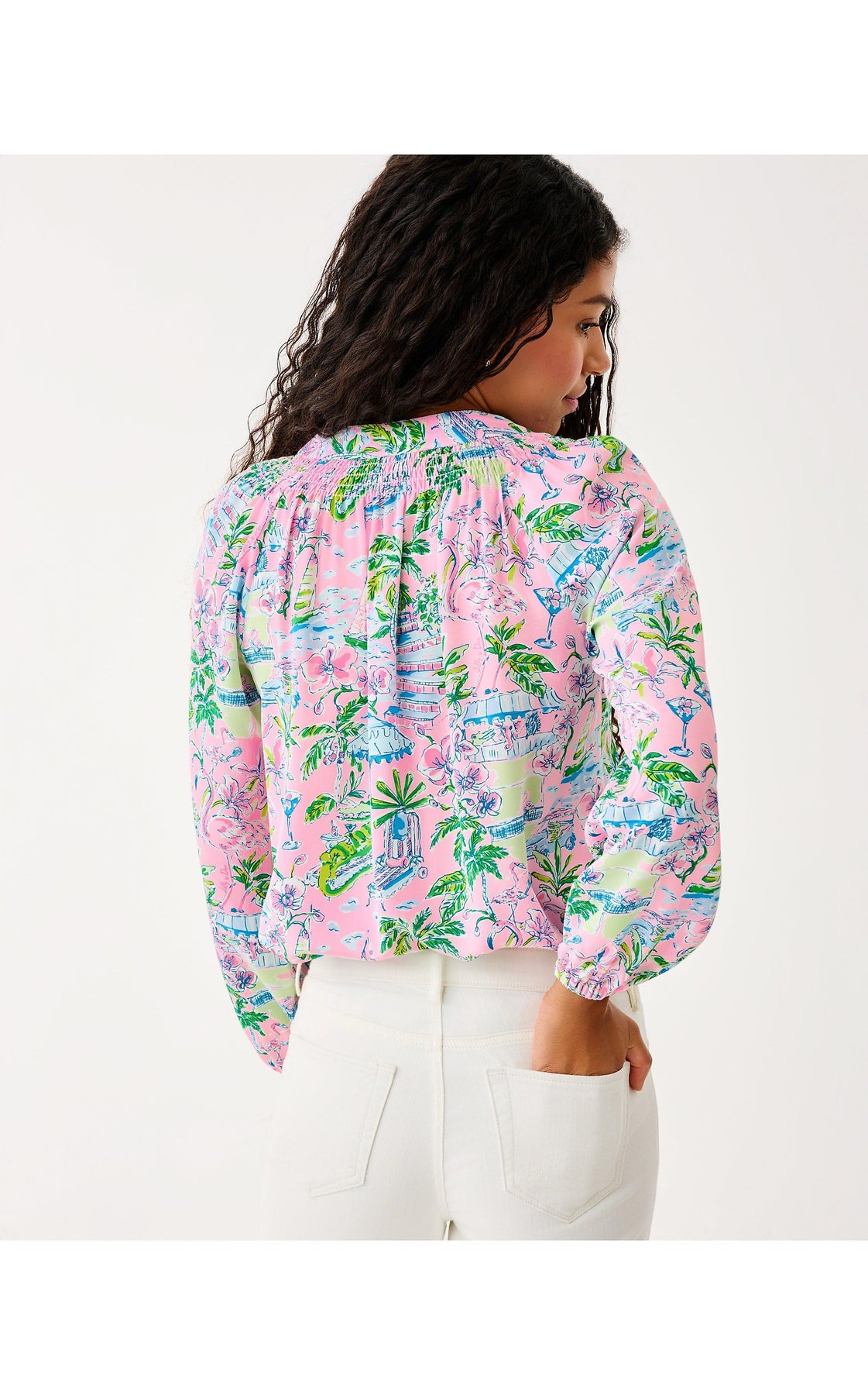 Easy fit, pullover blouse with gold buttons and bracelet-length sleeves.